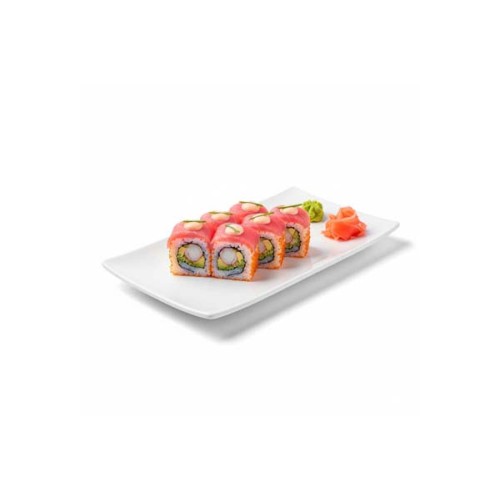 Soy Paper Wrapped w/tempura shrimp, avocado, mango, mayo, crab stick, mango sauce